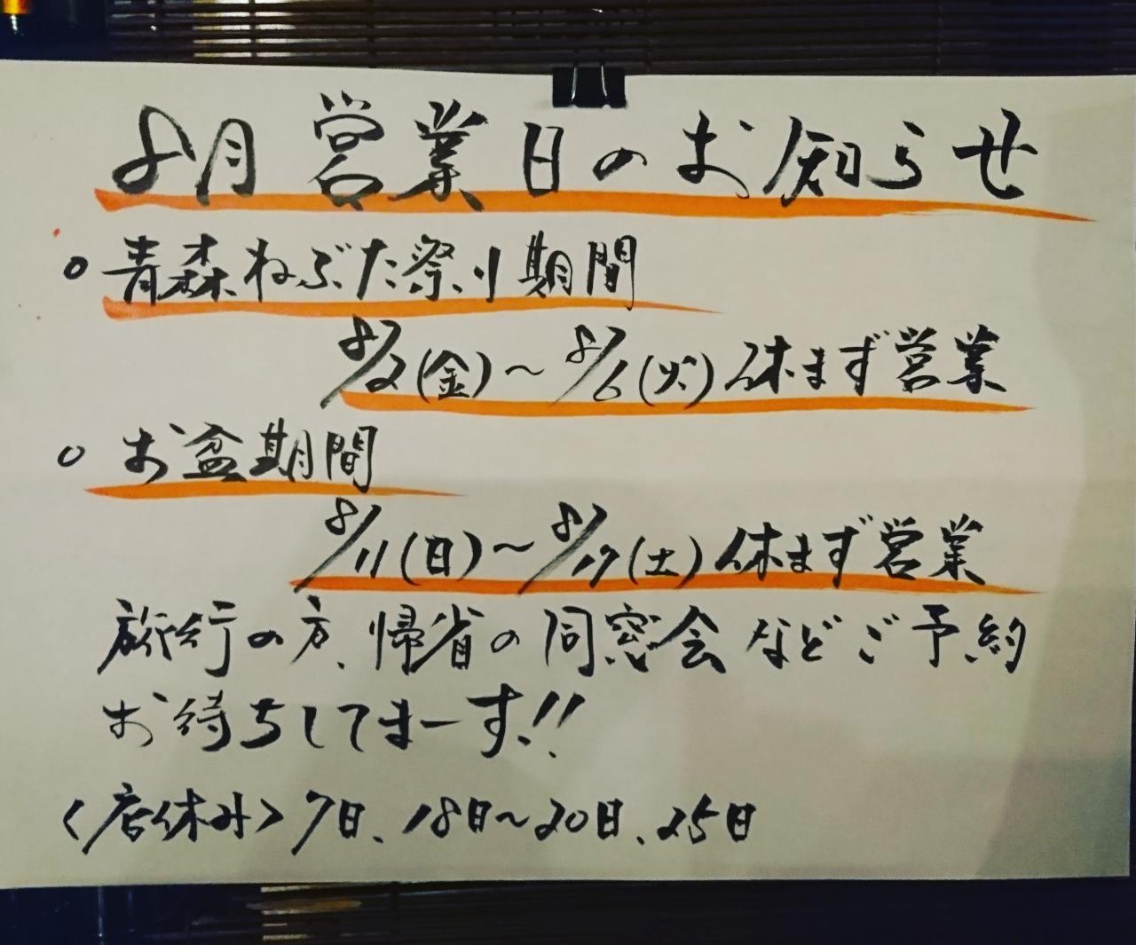 青森ねぶた祭り、お盆はもちろん休みませーん! 旅行の方や、帰省で同窓会を考えている方、ご予約お待ちしてまーす! #青森居酒屋 #おまかせコース #飲み放題あり #青森地酒多種 #青森夏限定酒 #飲み放題コース4000円~ #青森市古川 #青森駅周辺 #青森ねぶた祭り